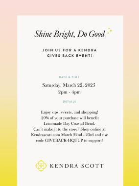 Can't make it to the store? Shop online at Kendrascott.com March 22nd - 23rd and use code GIVEBACK-HQTUP to support!